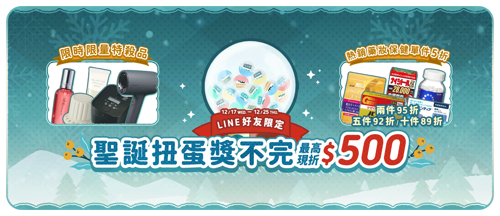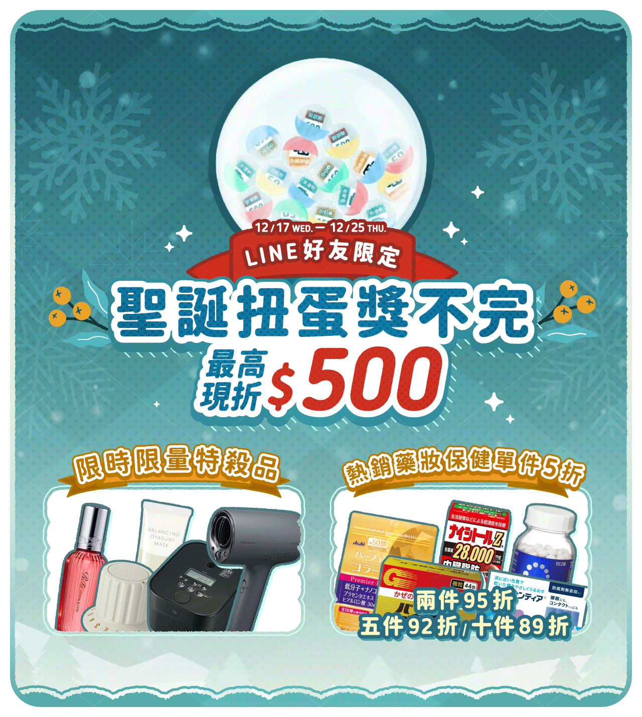 12/17-12/25聖誕限定🎄加官方line玩必中扭蛋|最大獎500現折券