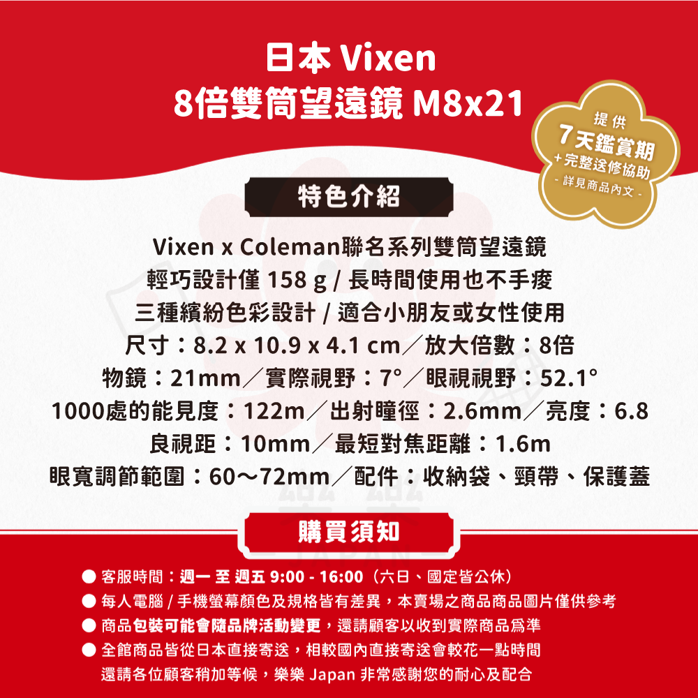 日本,Vixen,x,Coleman聯名雙筒望遠鏡,M8×21,8倍,輕便型,演唱會,音樂劇,戲劇觀賞,戶外活動