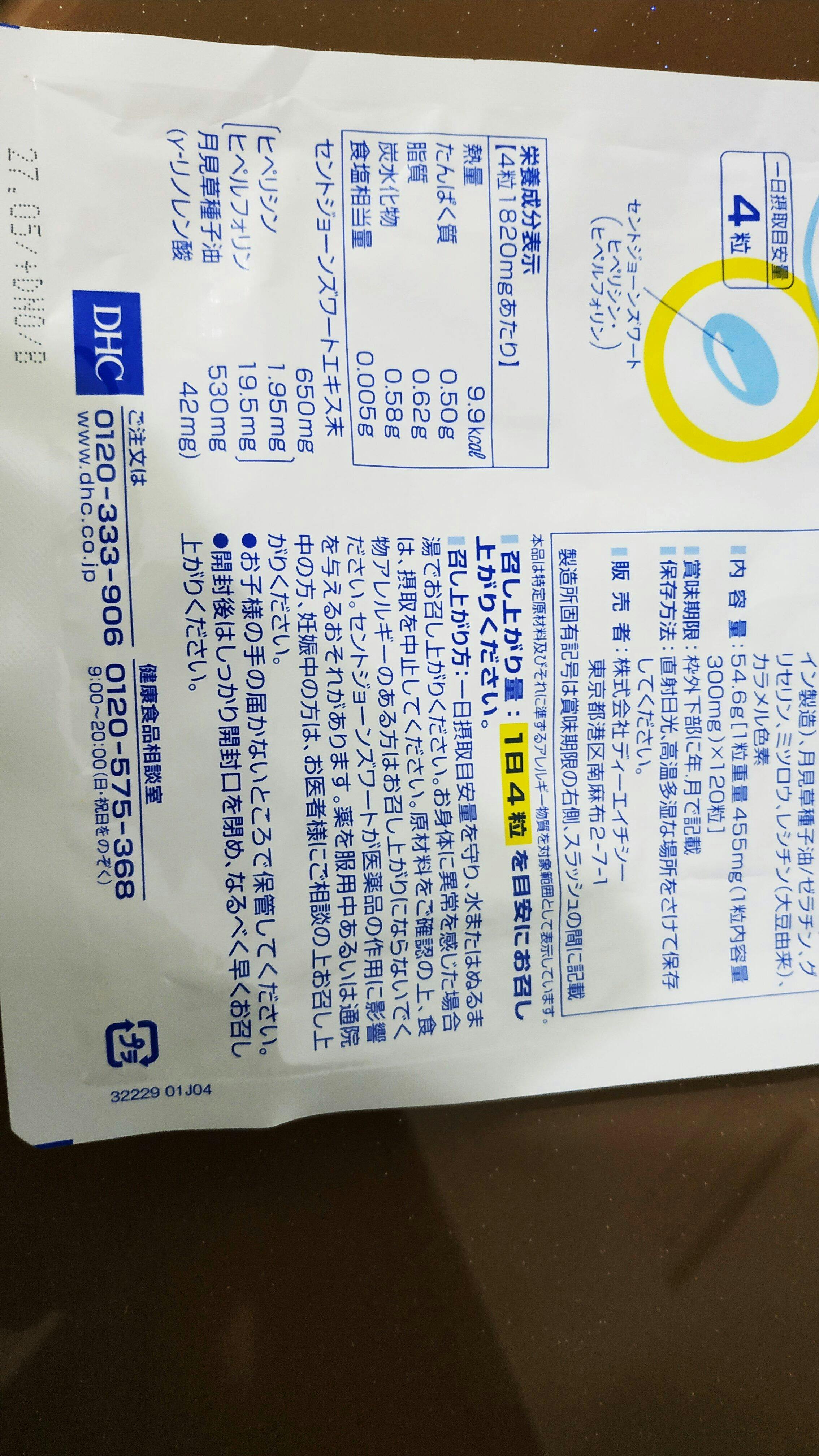 聖約翰草萃取末650毫克(金絲桃素1.95毫克、金絲桃苷19.5毫克)、月見草種子油530毫克(γ-亞麻酸42毫克)