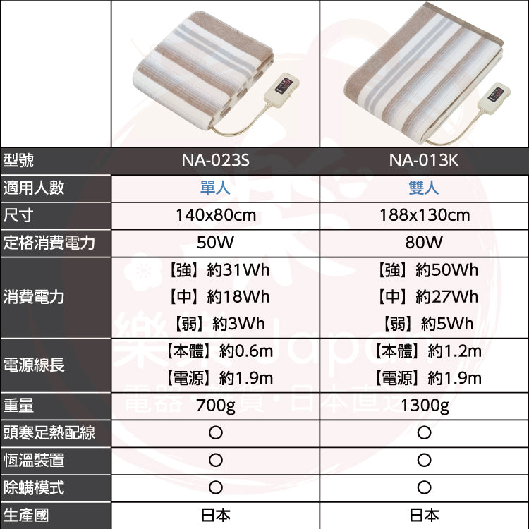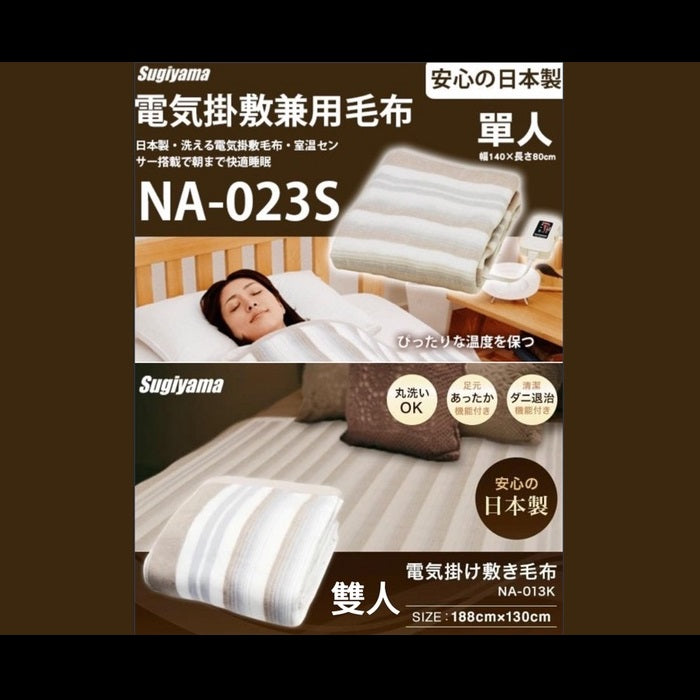 日本,Sugiyama,椙山紡織,電熱毯,電毯,電暖毯,毛毯,暖毯,暖墊,電氣毛布,電暖器,暖手,暖腳,暖氣,暖房,床墊型,鋪式,恆溫,溫控,可機洗,冬天,保暖,節能,省電,居家,租屋族,,NA-023S,NA-013K,日本製,冷氣房,體虛,手腳冰冷,單人電熱毯,雙人電熱毯,省電,節電,塵蟎,除蟎,過敏,皮膚過敏,頭寒足熱,安全,簡單操作,易操作,條紋設計,生理期,經痛,保暖,寒流,天氣冷