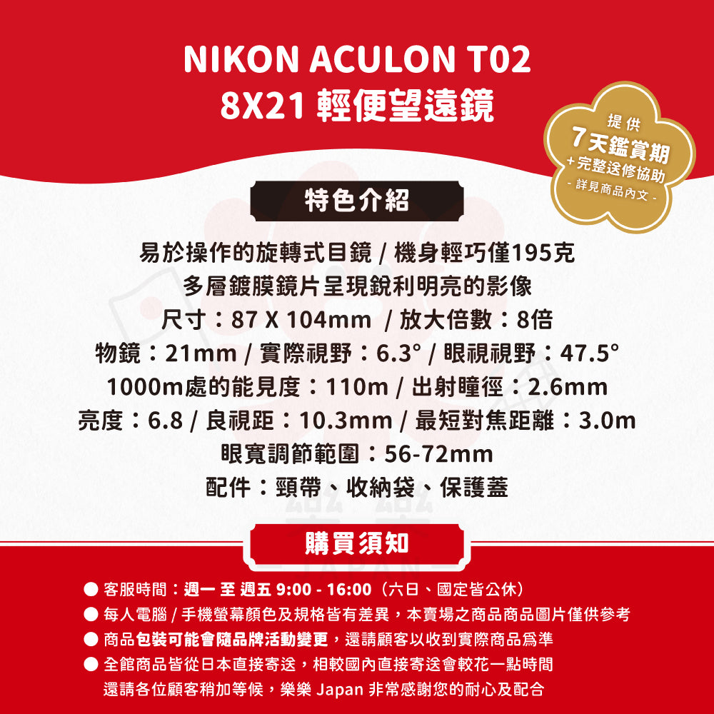 NIKON,ACULON,T02,8X21,雙筒,輕便,輕便型,T01,升級版,8x21 ,輕巧,口袋型,入門款,8倍放大,21mm口徑,多層鍍膜鏡片,明亮清晰視野,輕巧機身,時尚外觀,多種顏色,旋轉伸縮眼罩,舒適握感,簡單操作,輕鬆觀賞,便於攜帶,觀劇,戶外活動,運動賽事,演唱會,風景欣賞,目標客群,旅行愛好者,戶外活動愛好者,賞鳥愛好者,送禮選擇,光學,倍率,口徑,視野,鍍膜,鏡片,對焦,時尚,觀賞,旅行,戶外,賞鳥,觀星,風景,入門,高CP值,送禮,生日禮物,交換禮物,情人節禮物,聖誕禮物