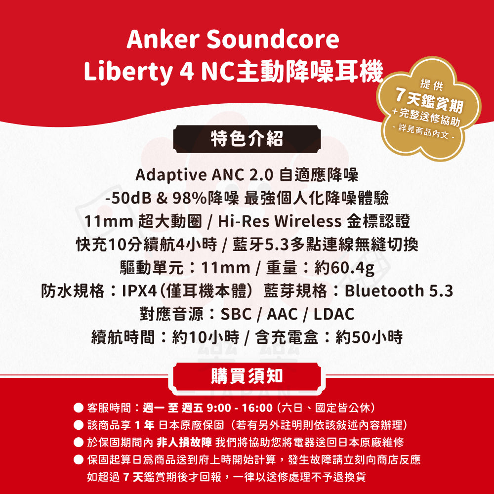 ANKER,Soundcore,liberty4nc,頂級主動降噪真無線藍牙耳機,降噪耳機,通透模式,LDAC,bluetooth5.2,BT5.2,bluetooth5.3,BT5.3,Hi-Res,防水耳機,入耳式耳機,耳道式耳機,IPX4,抗風噪,Adaptive ANC 2.0,輕量耳機,手機耳機,AI降噪,HearID,離耳偵測,多點連線,多裝置,超高解析,定制EQ音效,通話降噪,自適應降噪,舒適佩戴耳塞,運動耳機,智能觸控,高品質音樂體驗,ANC降噪,可調EQ音效,HD通話麥克風,無損音質,高階耳機,動態驅動單元,適合運動佩戴,自動播放暫停,無損聲音,AI語音增強,USB-C快速充電,高清低延遲,多點連接,負壓設計耳塞,智能耳壓平衡,極致音樂享受,安靜通勤耳機,時尚設計耳機,無縫音樂切換,多重降噪模式,高通話清晰度,動態低音加強,無縫遊戲耳機體驗,長效降噪性能,極致耳道貼合,3D空間音效,簡約高效操作,音質卓越體驗