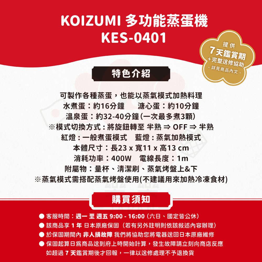 日本,KOIZUMI,小泉成器,多功能蒸蛋機,KES-0401/S,溫泉蛋機,水煮蛋,溏心蛋,全熟蛋,半熟蛋,煮蛋器,KES-0400,後繼新款,小泉蒸蛋機,煮蛋神器,蒸煮,雞蛋,外食族,租屋族,健身族群,增肌減脂,高蛋白,家庭主婦,蒸青菜,蒸蔬菜,花椰菜,青花菜,高麗菜,燒賣,冷凍食品,解凍,加熱,自動煮蛋機,定時,輕鬆烹煮,簡單操作,易清潔,好清潔,安全裝置,防止過熱,低溫加熱,日本暢銷品牌,象印煮蛋機,廚房家電,烹調用家電,餐廚用品