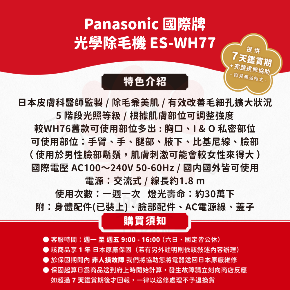 日本,Panasonic,ES-WH77,家用光學除毛機,美體除毛,脫毛,比基尼線,國際牌,WH76,WP82,可參考