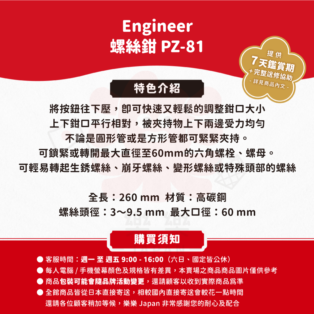 ENGINEER,高碳鋼,水管螺絲鉗,PZ-81,水管鉗,水道鉗,鯉魚鉗,暴龍鉗,崩牙剋星
