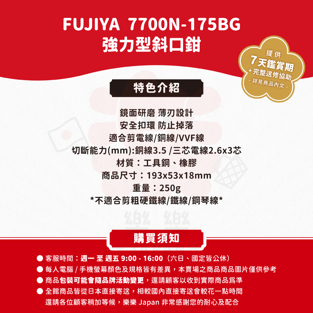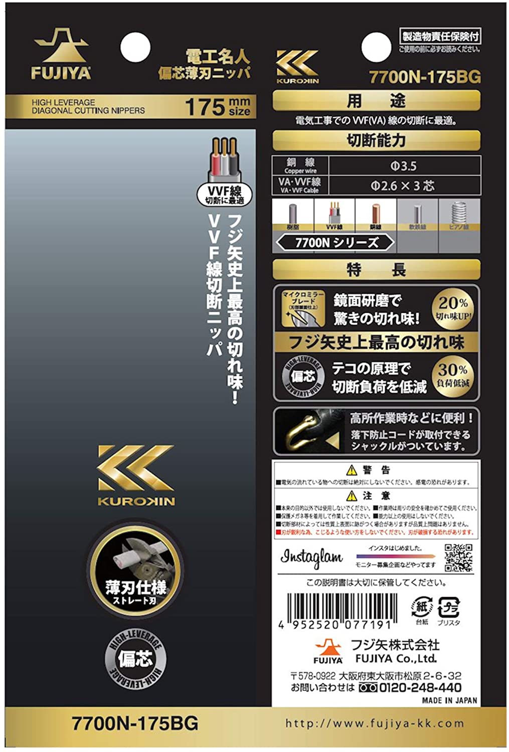 日本製,FUJIYA,富士箭,7700N-175BG,強力型斜口鉗-偏芯薄刃,黑金,斜口鉗,7700N-200BG