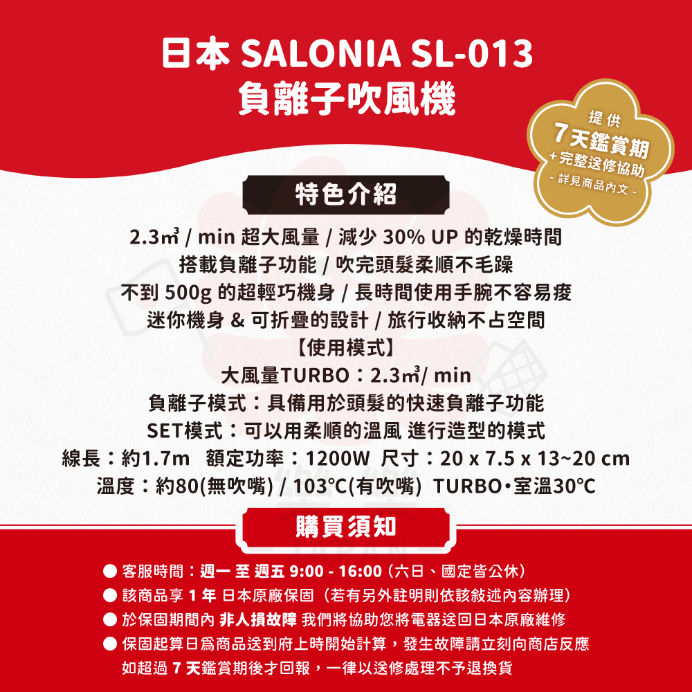 日本,SALONIA,負離⼦,吹風機,SL-013,⼤風量,速乾,護髮,輕量,折疊,保濕,抗毛躁,抗靜電,SL013,秀髮