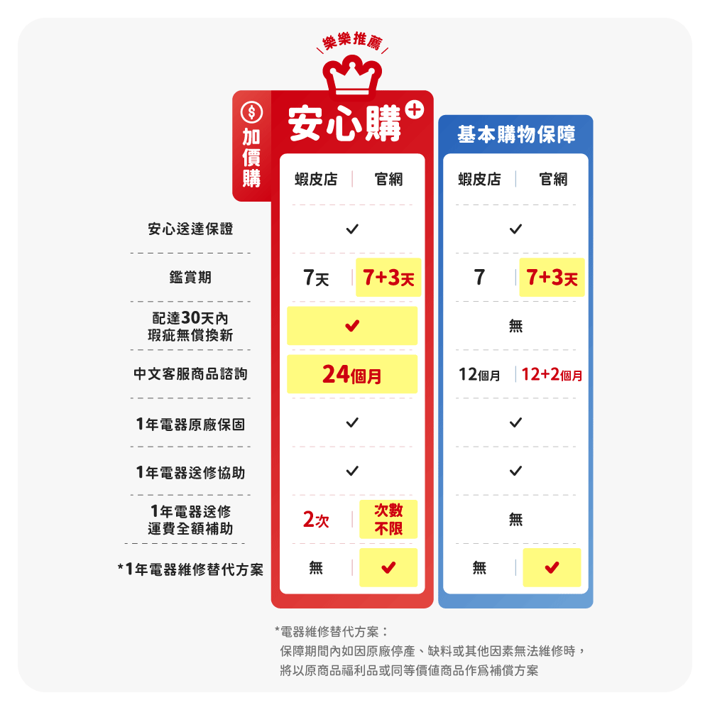 ※有加購「安心購+」之商品,則可享有配達30天內瑕疵無償換新。詳細說明請見樂樂安心購+