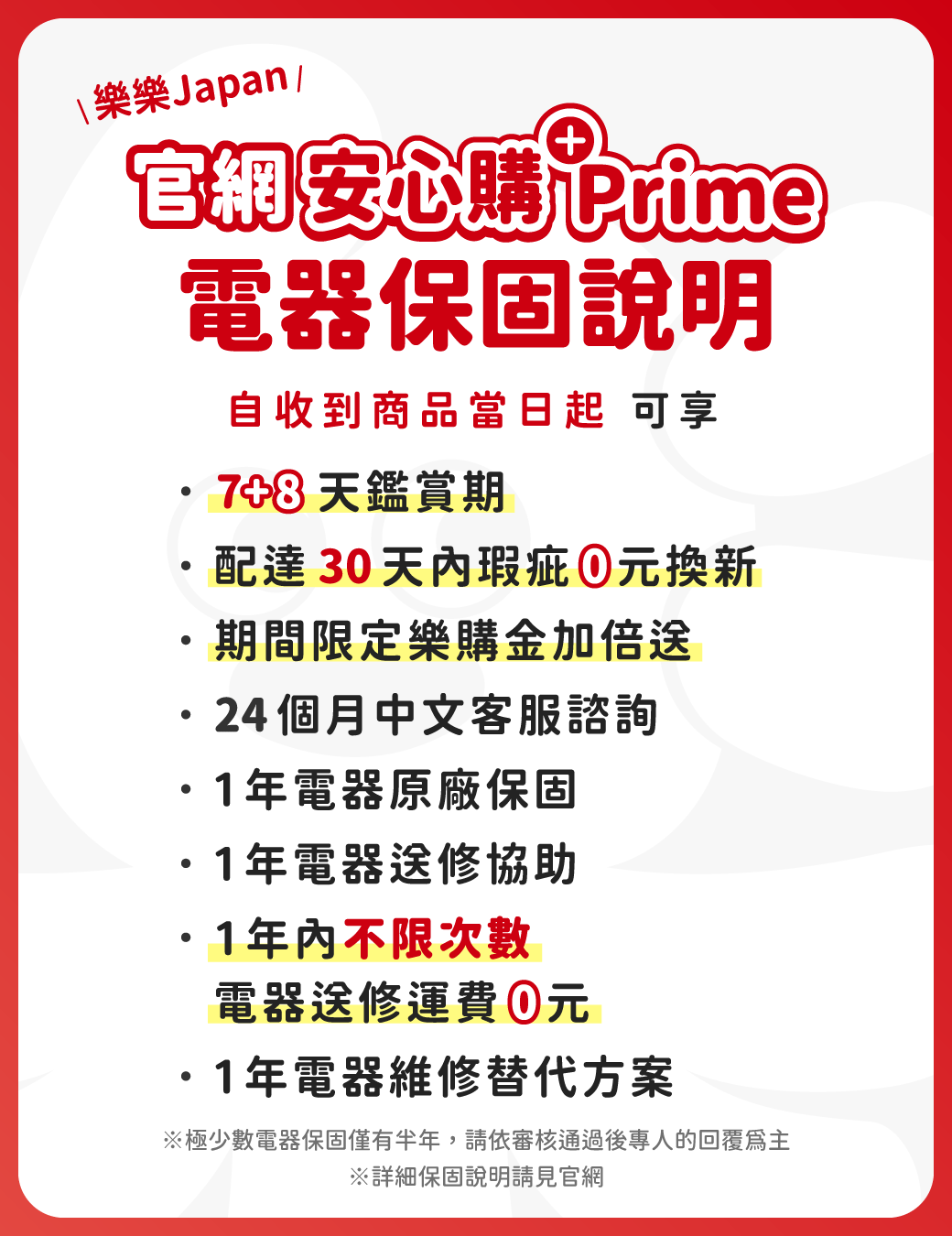 ・電器商品於收到商品當天開始計算1年內,到 樂樂Japan官方LINE 申請保固登錄,即享1年原廠保固