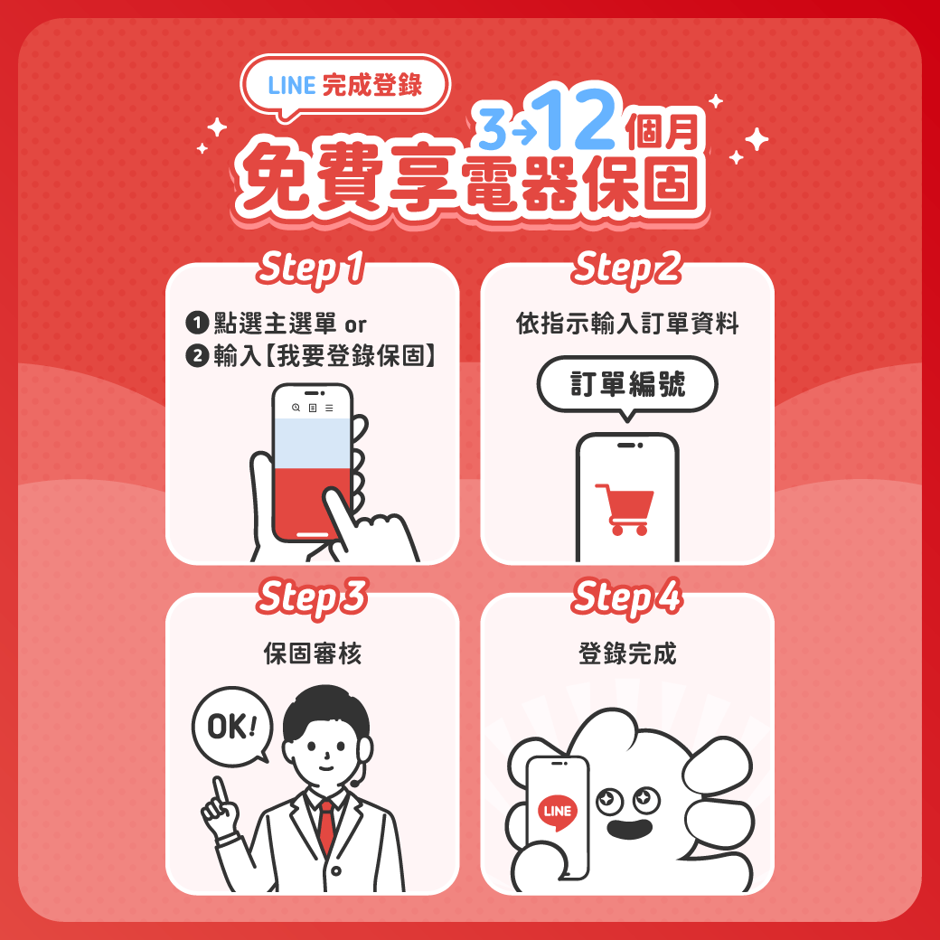 ・12個月內完成登錄:收到商品當日起算12個月內皆享免費保固服務